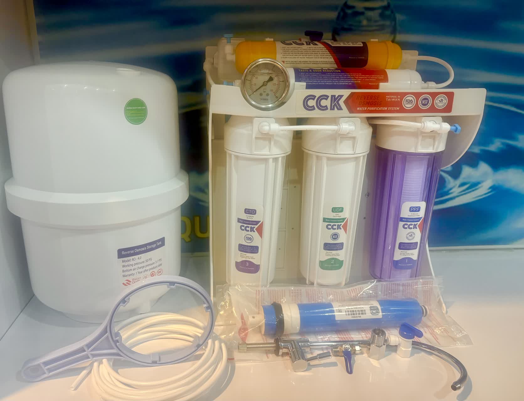 تصفیه آب سی سی کا هفت مرحله ای اکسیژن ساز CCK RO8_ORP، یک دستگاه مونتاژ ایران با قطعات چینی میباشد که از سیستم اسمز معکوس برای تصفیهی آب آشامیدنی لوله کشی شهری در هفت مرحله فیلتر تصفیه آب استفاده مینماید. این دستگاه دارای پمپ و مخزن ذخیره تحت فشار است و فیلتر ممبران اسمز معکوس آن یک فیلتر آمریکایی مارک فیلمتک Filmtec میباشد.