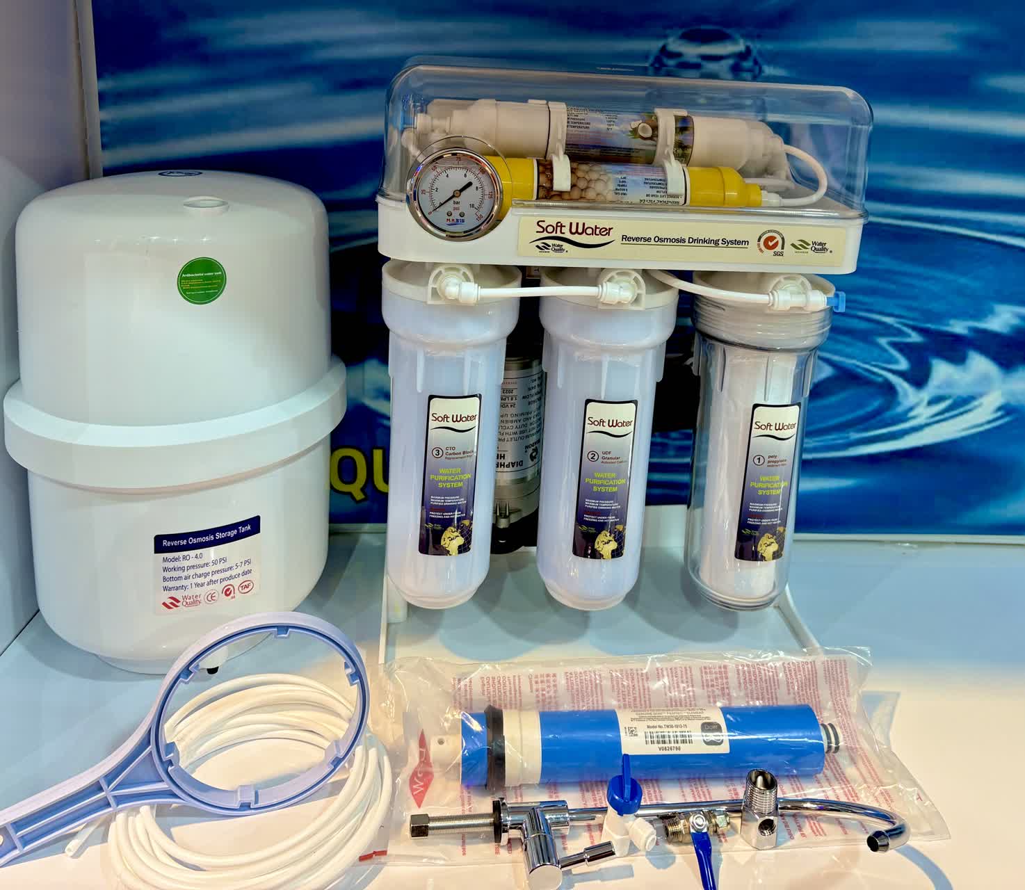دستگاه تصفیه آب خانگی سافت واتر Soft Water با 6 فیلتر یکی از بهترین نمونه های تولید شده توسط کمپانی بزرگ سافت در سالهای اخیر است. همچنین دستگاه تصفیه کن خانگی سافت واتر ( Soft Water) به تکنولوژی اسمز معکوس یا RO مجهز می باشد.